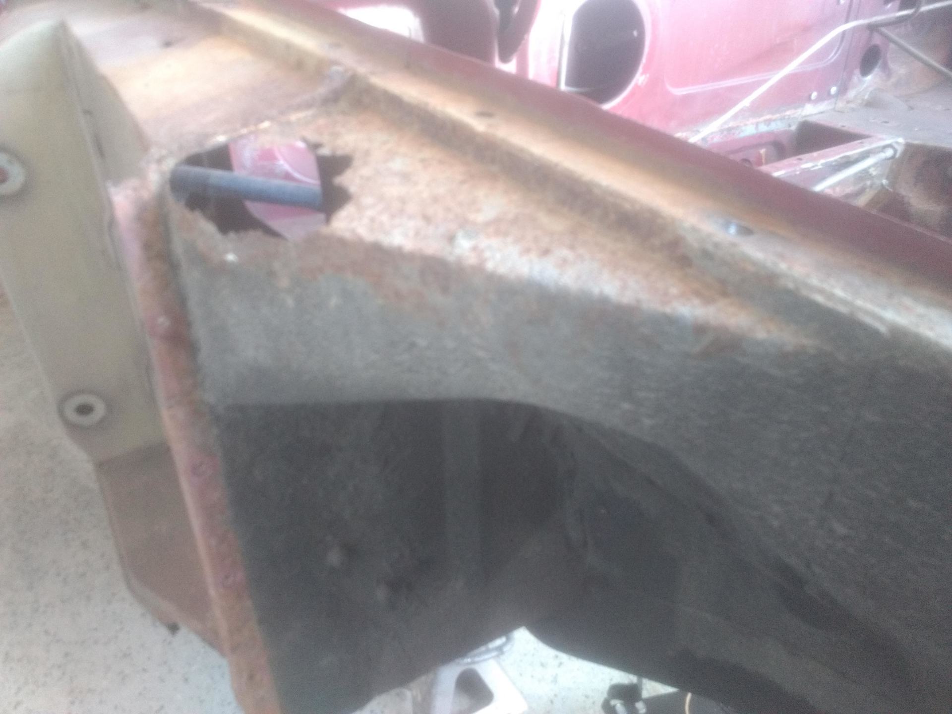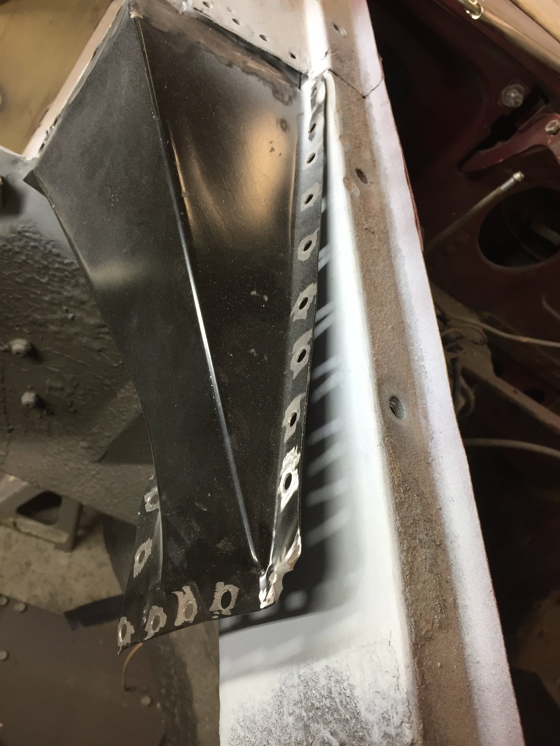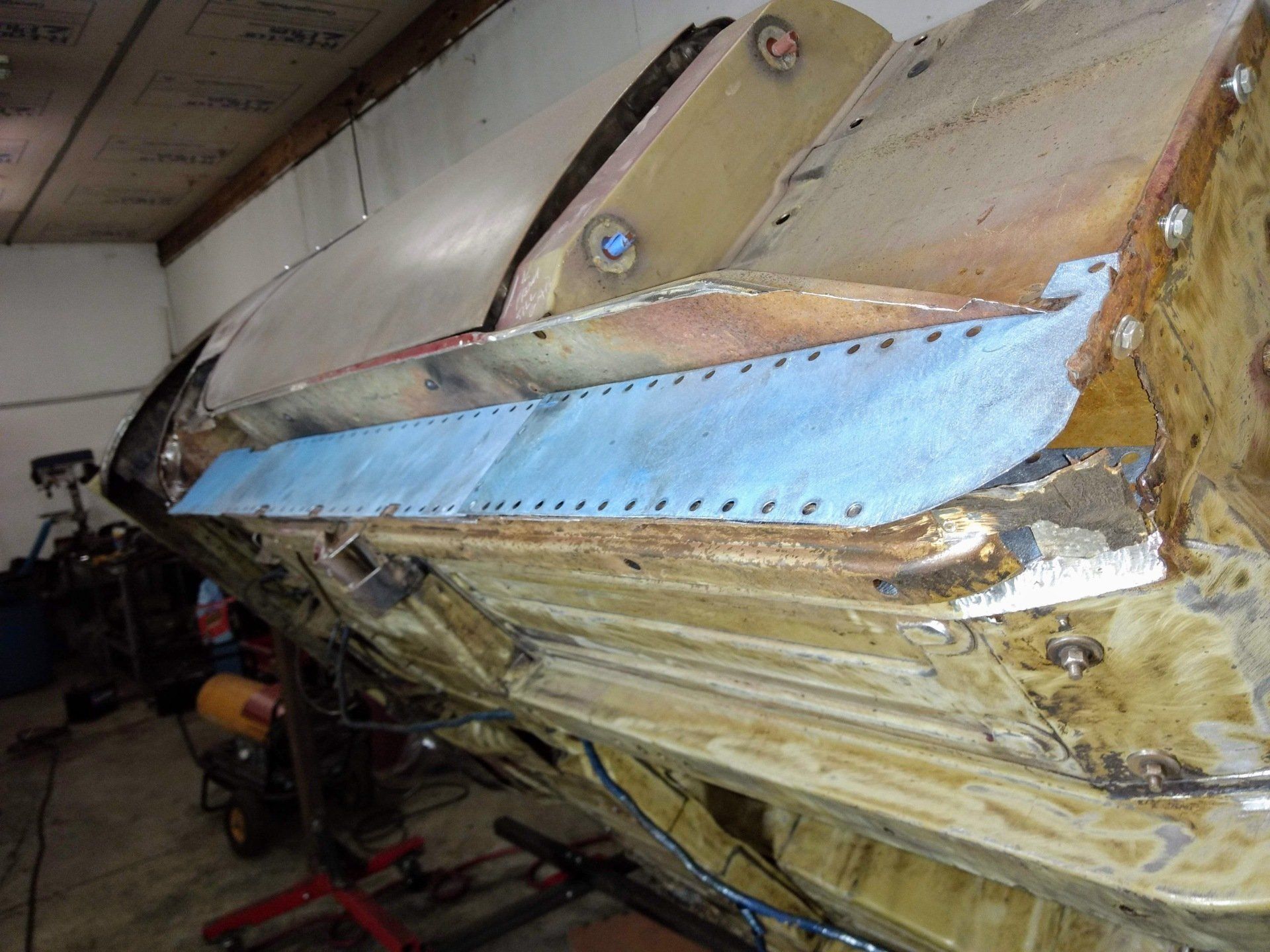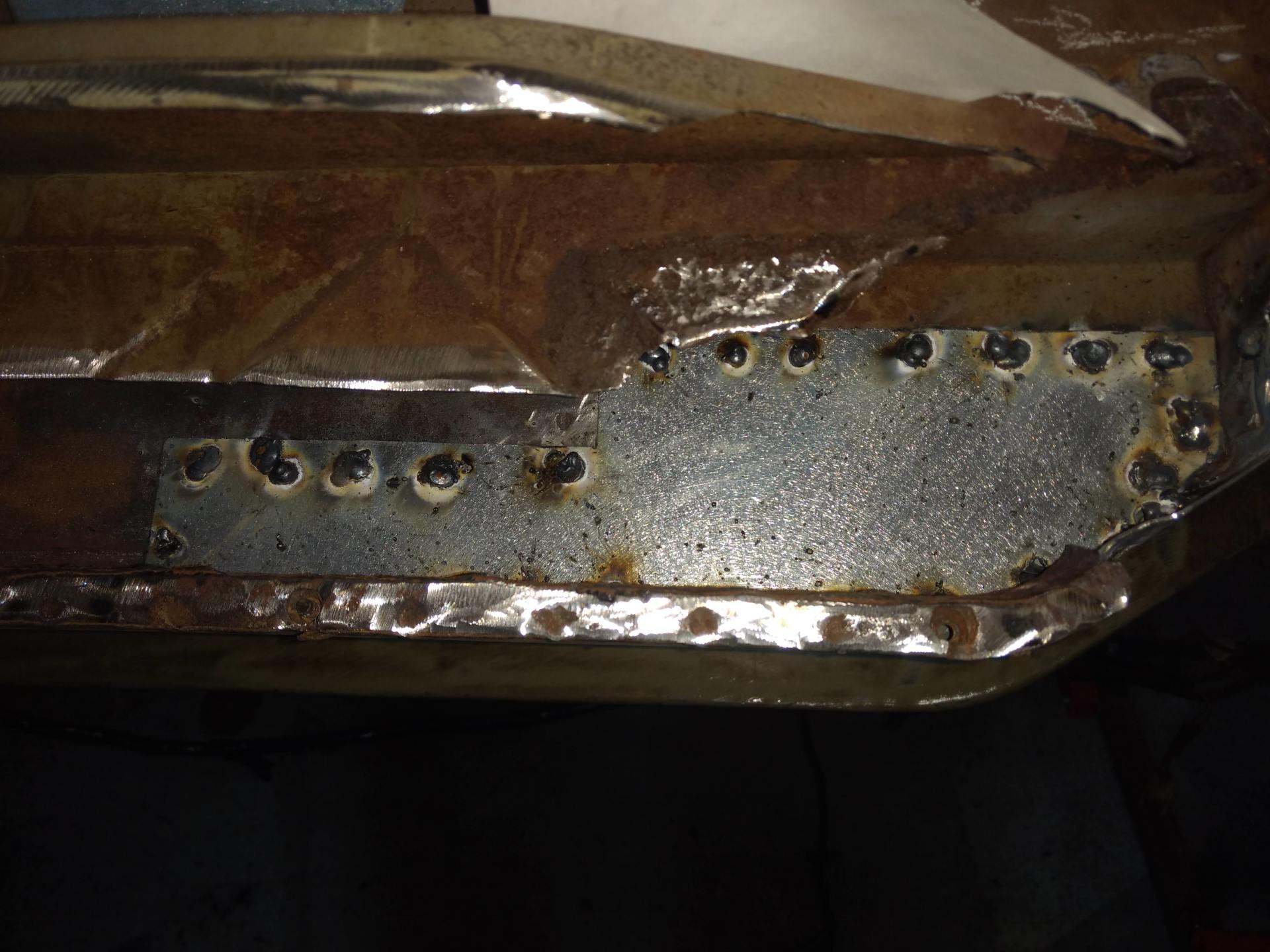 Here are some pics of metal removal, patch panel fab and installation to the inside of the PS rockers. One thing to pay attention to, as pointed out in the pics, and why I suggested purchasing completely new rockers, is the small rust holes that pop up as the metal is being cleaned and prepped. This is an issue throughout and some hole are much bigger than others. These will all be repaired with new metal as they are found, but will require more fab work & patching, which will require more finish work. I'm trying to balance it out for your budget, but it's a tightrope act and not my preferred way to do this.