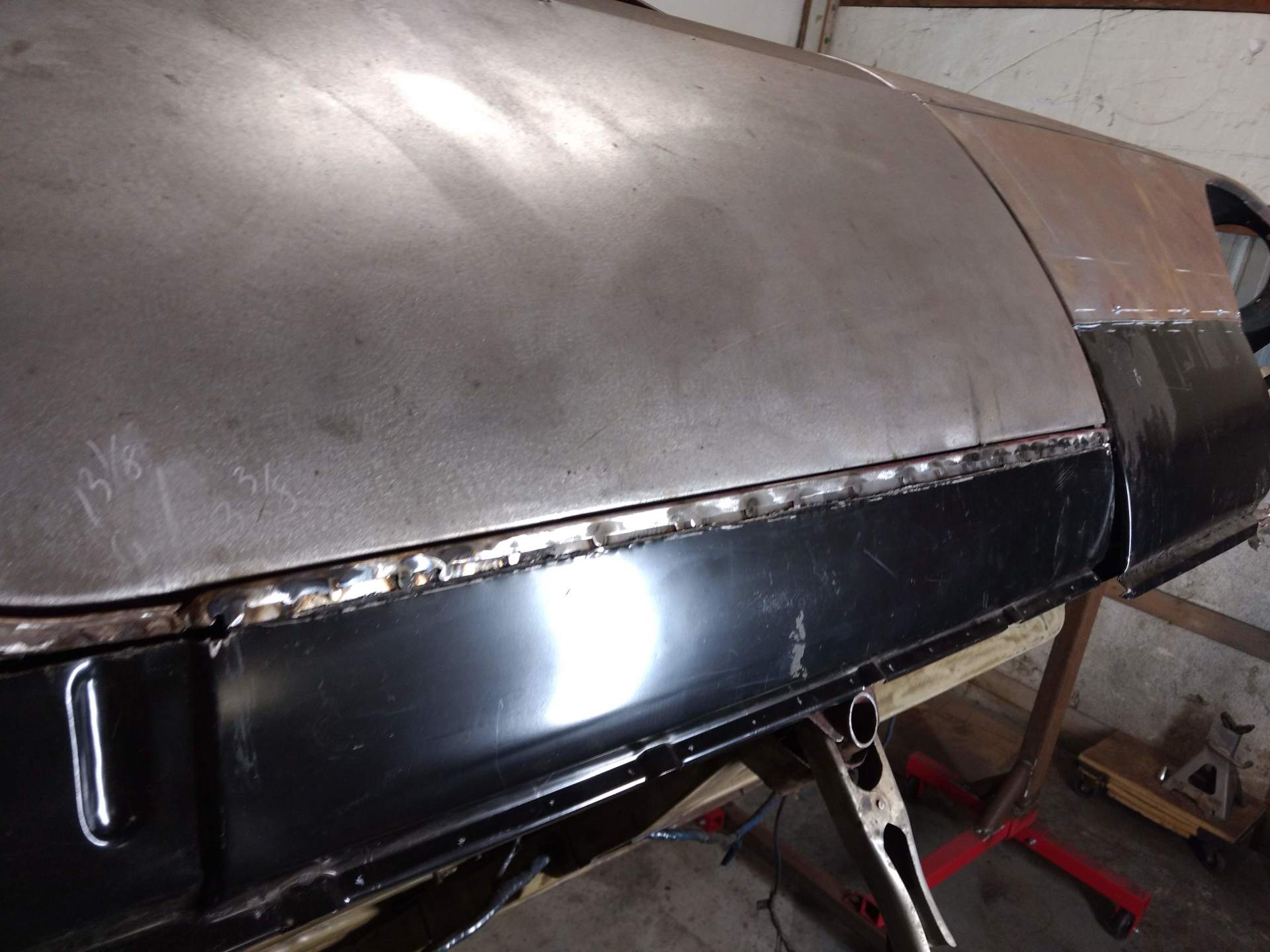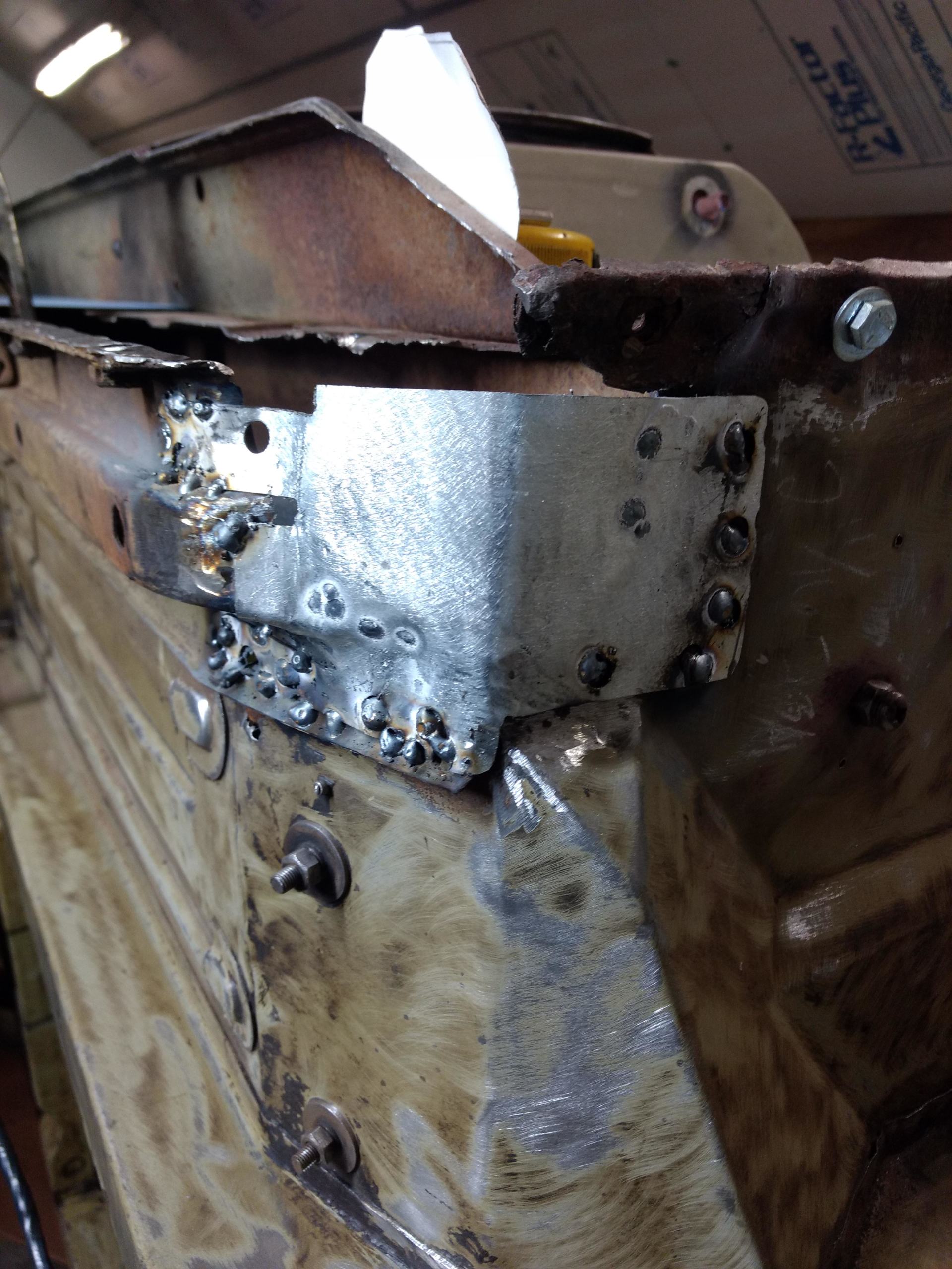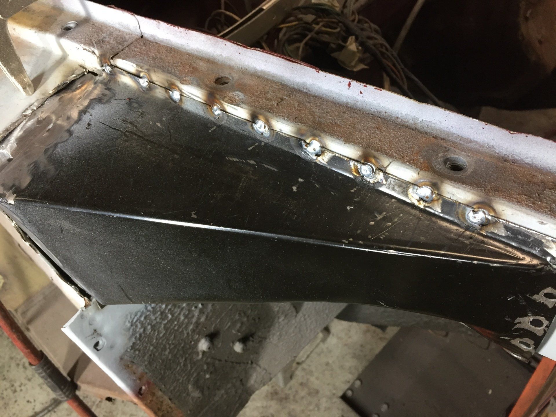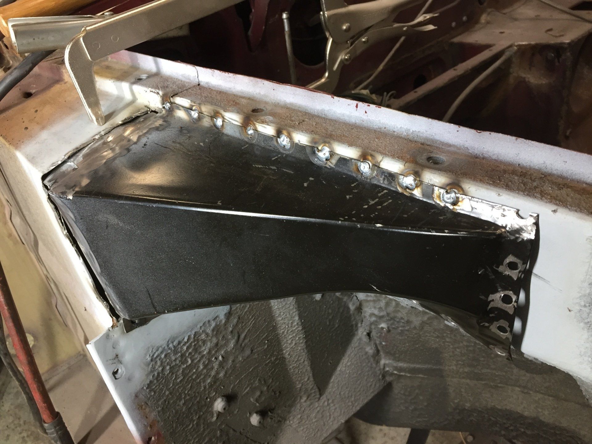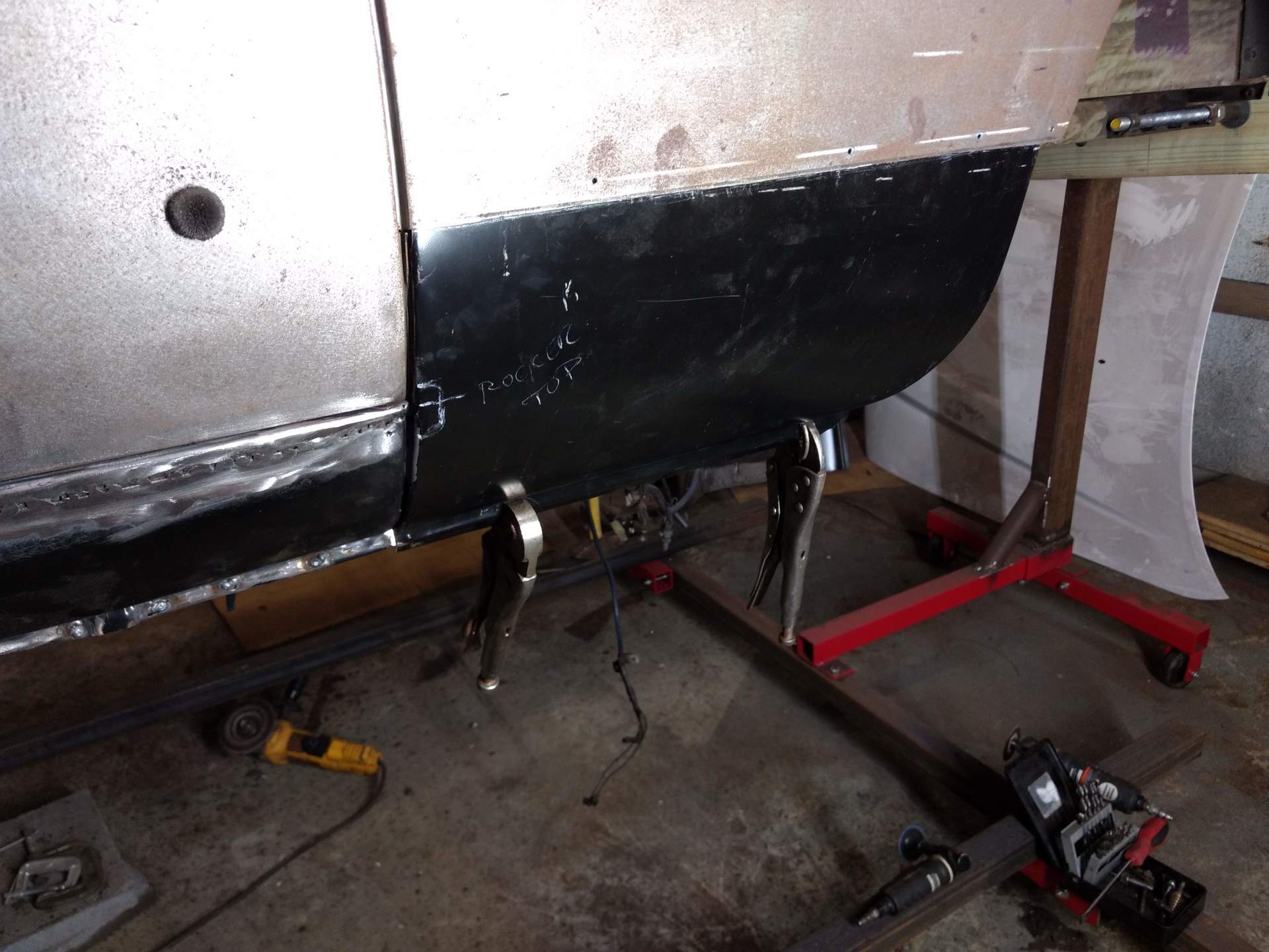 Here are some pics of metal removal, patch panel fab and installation to the inside of the PS rockers. One thing to pay attention to, as pointed out in the pics, and why I suggested purchasing completely new rockers, is the small rust holes that pop up as the metal is being cleaned and prepped. This is an issue throughout and some hole are much bigger than others. These will all be repaired with new metal as they are found, but will require more fab work & patching, which will require more finish work. I'm trying to balance it out for your budget, but it's a tightrope act and not my preferred way to do this.
